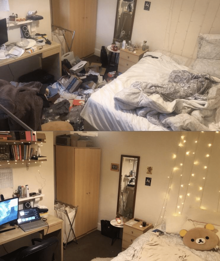 So, this person shared a comparison photo of their bedroom before and after their depression slump. You can see a clear difference between the photos. When someone neglects their hygiene and stops caring about their physical environment, it might be a sign of depression, as shown clearly by this first image.