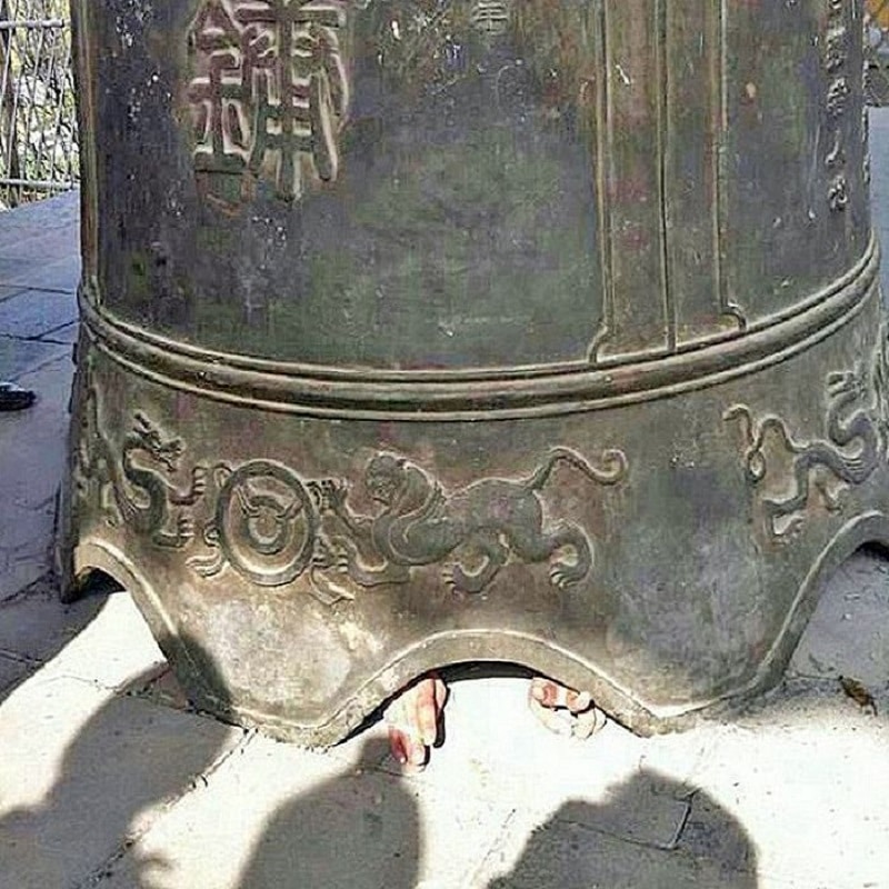 The bell, which comes from a Buddhist temple, came crashing down from out of the blue sky. It landed on the ground and trapped some unfortunate passerby, but he was completely fine under there. A bit scratched and probably dazed out of his mind from the bell’s sound, but fine nonetheless.