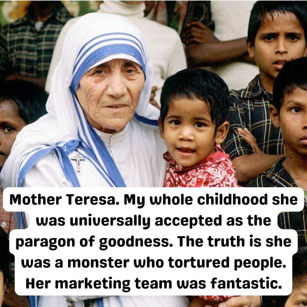 They do say that everything really comes down to marketing. Certainly, a lot of our modern-day celebrities and politicians are aware of that, but I didn’t realize Mother Teresa knew that, too. The good news is I was speaking to my kids about Mother Teresa and they’ve never heard of her, so I suppose her legacy’s done for anyway.