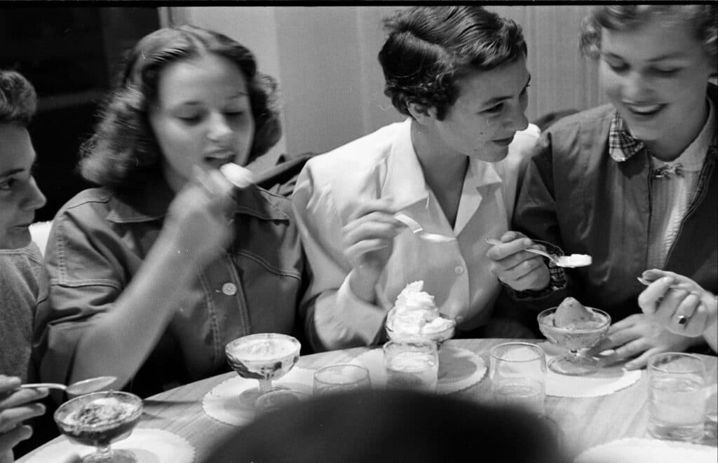 This scene features four students seated together at a long table, each enjoying a scoop of ice cream in the afternoon light. The relaxed atmosphere invites feelings of camaraderie and connection, much like those afternoons spent with friends after classes.