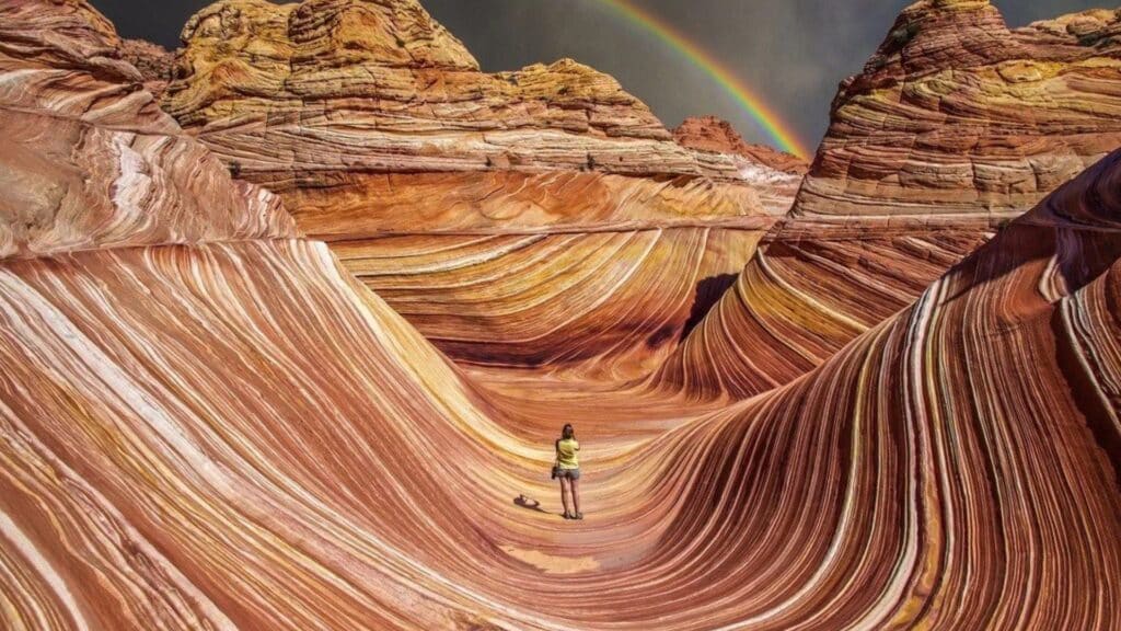 The Wave’s swirling sandstone ribbons appear too perfect to be natural. Its wavelike ridges and bold stripes make it look sculpted rather than eroded. Foot traffic is restricted to preserve the structure, adding to its legendary mystique. Depending on the angle of sunlight, the colors shift dramatically, intensifying the illusion of motion.